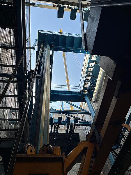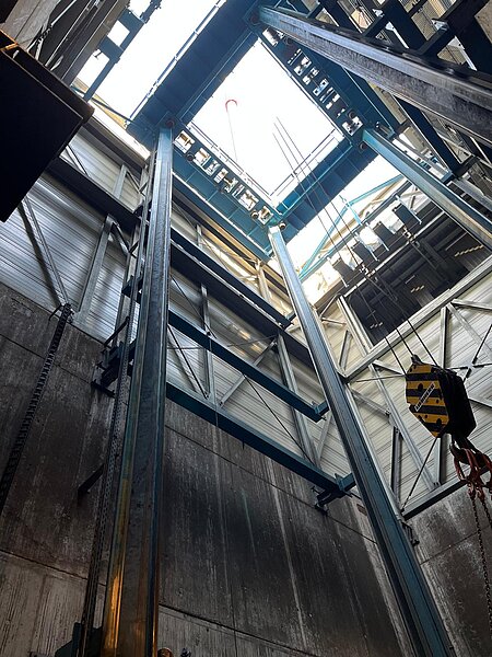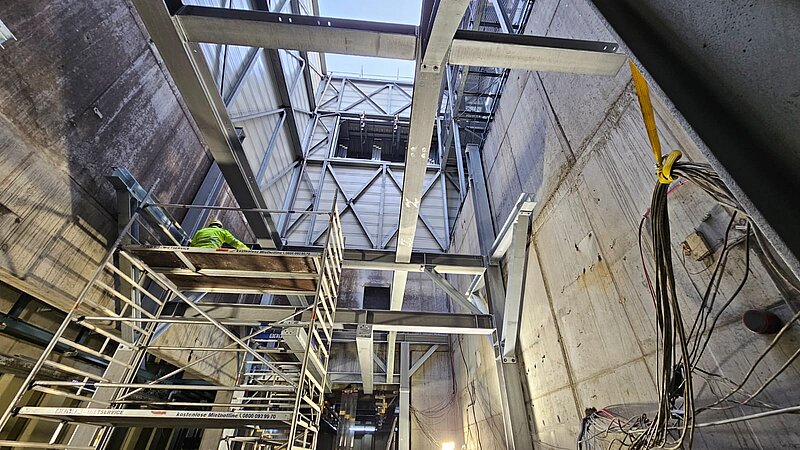 - Montage: Mit Kränen wurden die Bauteile direkt in die Schächte gehoben und dort „fliegend“ montiert, ohne Platz für Hilfsmittel. Teilweise mussten dafür 7 Meter hohe Gerüste errichtet werden.